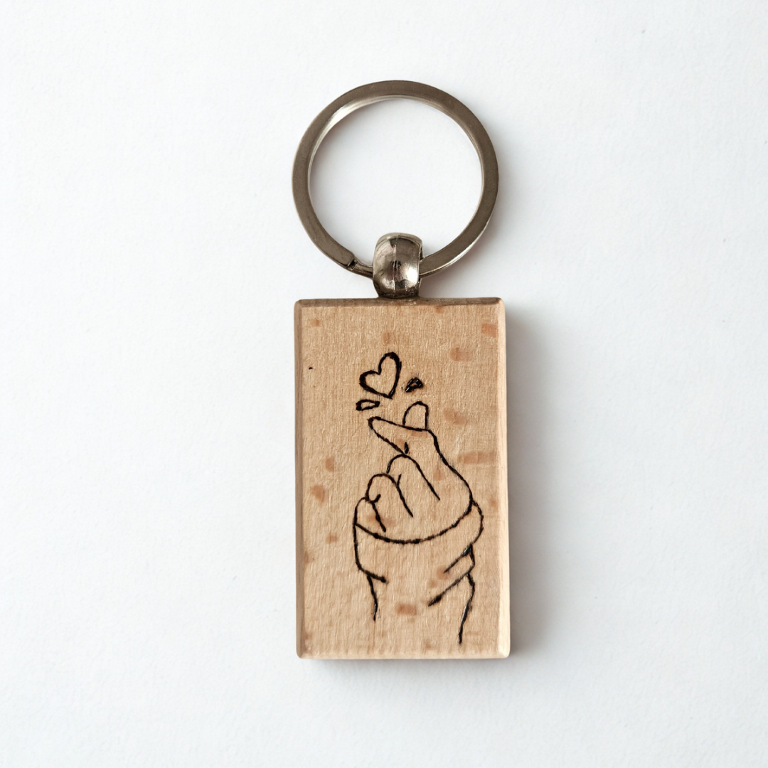 Portachiave in legno pirografato “Mano con cuore” | Incisi col Fuoco
