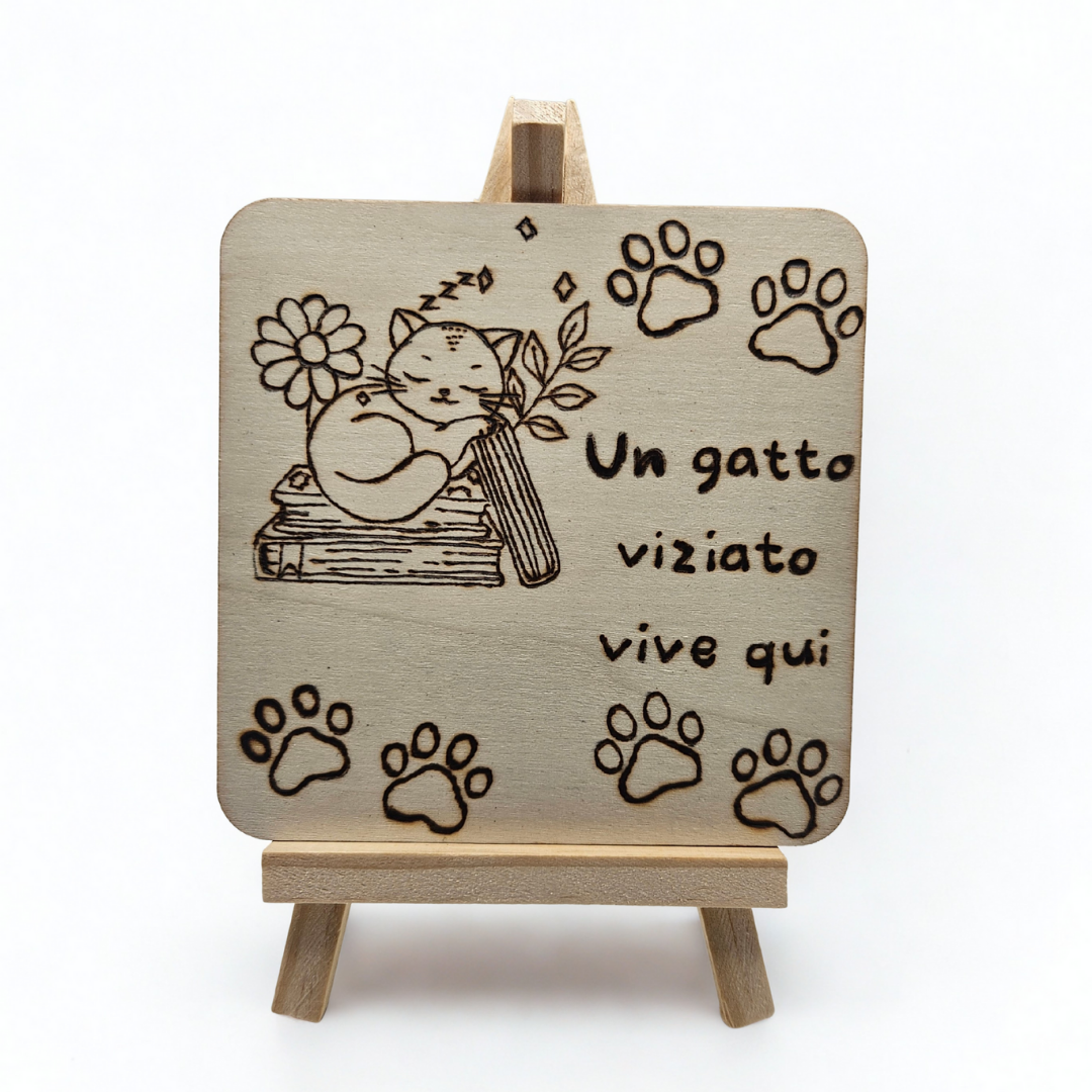 Tavoletta in legno “Un gatto viziato vive qui” – con cavalletto